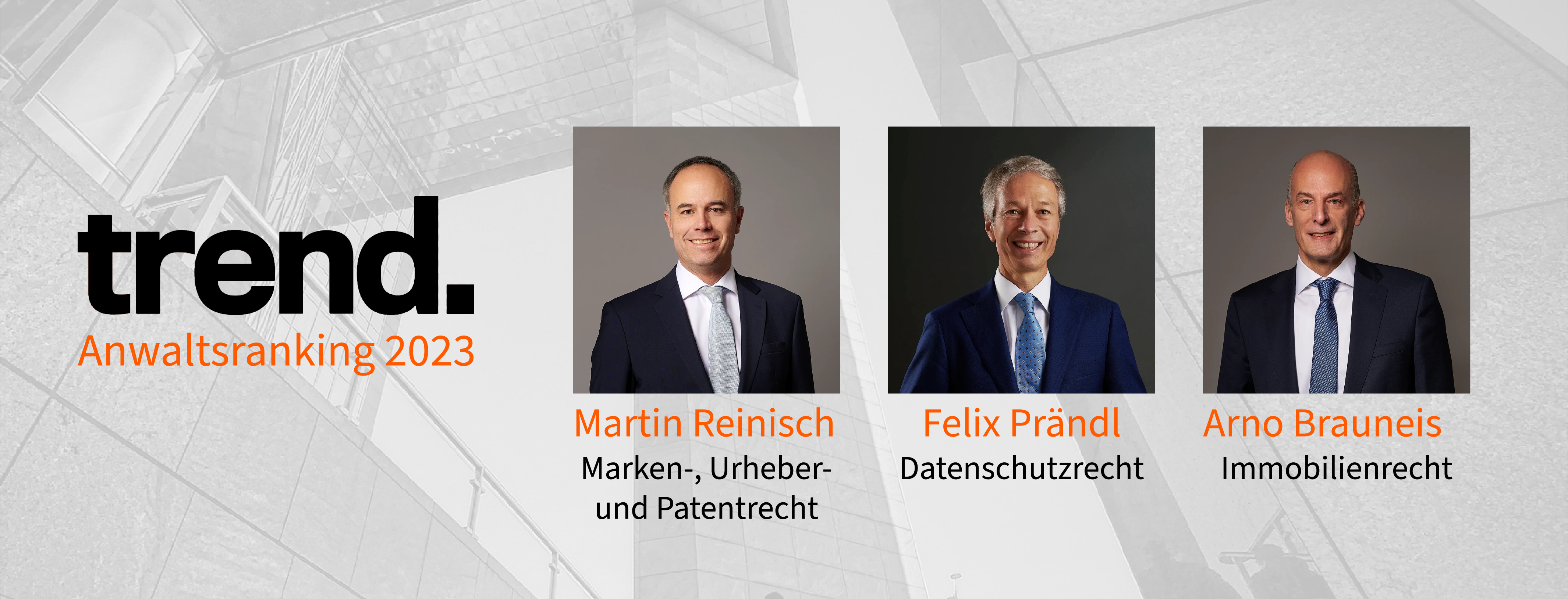 Wir freuen uns auch dieses Jahr im trend-Anwaltsranking wieder in mehreren Fachbereichen unter den Top 10 gelistet zu sein. Mag. Martin Reinisch wurde im Bereich IP, Dr. Arno Brauneis im Immobilienrecht und Dr. Felix Prändl im Datenschutzrecht genannt.